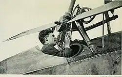 Several tractor-configured single-seat biplanes of the time featured machine guns mounted on the centre section of the top wing to fire over the radius of the propeller to bypass the need for synchronization gears). Both the French mountings and the British Foster mounting allowed a machine gun to be tipped back to reload and whether by accident or design, this allowed the gun to be held at an intermediate angle (ideally about 45°) and fired upward, steadying the gun and firing it with the "normal" trigger rather than the remote Bowden cable used for forward firing. These could then be used to attack enemy aircraft from the blind spot below the tail. Most notable of the airplanes used were the Nieuport 11, 16 and 17 and 23 fighters from 1915 onwards, and the tactic was continued in British service, with the Royal Aircraft Factory S.E.5s and Sopwith Dolphin. That Dolphin entered service near the end of World War I, and was delivered with a pair of .303 in (7.7 mm) Lewis guns on a cross-tube connecting the upper wing spars. British ace Albert Ball in particular was a great exponent of this technique,[2] The Germans copied the arrangement in 1917, when Gerhard Fieseler of Jasta 38 attached two machine guns to an Albatros D.V, pointing upwards and forwards.