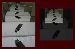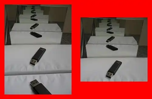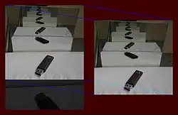 | Mirror-in-mirror images as counterexample: The left image can be embedded into the right one and vice versa (below, left/mid); yet, both aren't similar. The Schröder-Bernstein theorem applied to the unstructured pixel sets obtains a non-continuous bijection (right). | ||