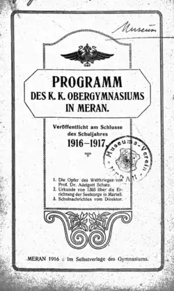 Starting in 1899, the programs were officially renamed as annual reports. Although this name change took time to become widely accepted, the term Schulprogramm is still commonly used for these reports today. Additionally, the much older lecture advertisements have long been categorized in literature as Schulprogramm.[9]