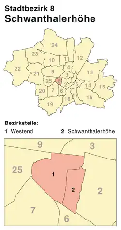 Schwanthalerhöhe (German pronunciation: [ˈʃvantaːlɐˌhøːə] ⓘ; Central Bavarian: Schwanthalahäh), also called Westend, is a borough of Munich. It is located west of the city center and with a population of about 30,000 on just two square kilometers is one of Munich's most densely populated boroughs.[1]