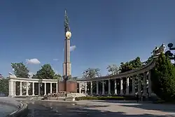 In August 1945, immediately after the end of World War II, the Soviet military and Austrian officials revealed the "Heroes' Monument of the Red Army" (now popularly referred to as the "Russian Monument") behind the Hochstrahlbrunnen fountain.[1] Until 1955, a Soviet T-34 tank was placed there. During the occupation, the southern part of square was renamed Stalin Square on 12 April 1946, and this name was officially effective until 18 July 1956. The "Haus der Industrie" (House of Industry), then No. 4 Stalin Square, was the seat of the Allied Council of the four occupying powers until 1955.