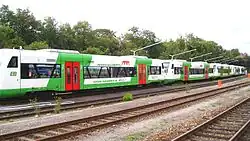 Since 2004 rail services on the line between Schweinfurt and Meiningen have been operated by the Erfurter Bahn (EB) whose Lower Franconia Shuttle (Unterfranken-Shuttle), line EB 4, runs every two hours between Schweinfurt and Mellrichstadt from Monday to Friday and, on Saturday am and Sunday pm, almost hourly. In addition DB Regionalexpress trains run every two hours from Erfurt to Schweinfurt (RE 7) (on this section from Ritschenhausen). Since 2008 the DB has used tilting trains which attain speeds of up to 160 km/h. The Erfurter Bahn also operates the EB 5 Regionalbahn route (the Franconian Saale Valley railway or Fränkische Saaletalbahn) using the Unterfranken-Shuttle on the Schweinfurth–Eberhausen line and running it through to Bad Kissingen and Gemünden am Main. The „Unterfranken-Shuttle“ also calls at Schweinfurt-Mitte and Schweinfurt-Stadt via Schweinfurt Hauptbahnhof. The DB uses Class 612 DMUs exclusively whilst the Erfurter Bahn operates Stadler Regio-Shuttle RS1 multiples.