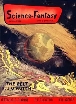 In the first issue, Gillings declared that he was interested in science fantasy "in all its forms: with its significant ideas, its surprising prophecies, its sheer fictions, its evolution as a fascinating literature".[14] Stories in the first issue, drawn from Gillings' inventory of material acquired for Fantasy, included "The Belt", by J.M. Walsh; "Time's Arrow", by Arthur C. Clarke; and "Monster", by John Christopher, writing as Christopher Youd.[1] Gillings also included several non-fiction features, such as his fanzine, Science Fantasy Review, incorporated into Science Fantasy as a department, and condensed to a few pages. In the first issue Gillings reviewed an article about science fiction by Jacob Bronowski which had appeared in the Continental Daily Mail.[15] There were also three book review columns: two by Gillings, writing under pseudonyms, and one by John Aiken, the son of poet Conrad Aiken.[1]