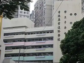 The upper secondary section was founded in 1975.[5] In the 1980s the Mongkok Workers' Children School moved toward becoming a more mainstream institution. It participated in the Hong Kong Certificate of Education Examination (HKCEE) for the first time in 1980.[5] It was among several leftist schools that lobbied for government subsidy from the mid-1980s.[13][14] The Hong Kong Government launched the Direct Subsidy Scheme (DSS) in 1991 to provide grants to private schools. The Mongkok Workers' Children School, previously classified as a Private Independent School (PIS), was one of nine schools that joined the DSS at the outset.[15]