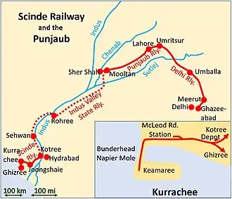 The Scinde Railway was first established by deed of settlement in March 1855 and incorporated by the Scinde Railway Act 1855 (18 & 19 Vict. c. cxv) in July of that year. The company contracted with the government to construct a line between Karachi and Kotri. The company was granted a 5% return on investment up to a maximum of £1 million in order to build the 120-mile line.[1][2] The Karachi-Kotri Railway Line work commenced in April 1858 and on 13 May 1861 succeeded in connecting Karachi to Kotri. This was the first railway line for public use between Karachi and Kotri, a distance of 108 miles (174 km).[3] The company was involved in a number of additional railway line projects, as well as the establishment of the Indus Steam Flotilla along the Indus River and Chenab River. The Scinde Railway Act 1857 (20 & 21 Vict. c. clx)[1] granted it the opportunity to extend its operations. In 1870, the Scinde Railway Company was amalgamated with the Punjab Railway and Delhi Railway companies and renamed as the Scinde, Punjab & Delhi Railway company. This was covered by the Scinde Railway Company's Amalgamation Act 1869 (32 & 33 Vict. c. lxxx).[1]