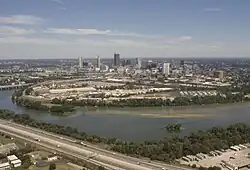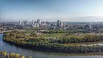 Scioto Audubon Metro Park is located on Columbus's Whittier Peninsula. It borders the Brewery District to the east, Interstate 71 and the Scioto River to the north and west, and downtown to the northeast, and it is partially isolated by railroad tracks. The park is a 10-minute walk from downtown and gives views of the city skyline.[3] It was designed by MKSK, an urban planning and landscape architecture company that has made many Columbus-area works, including the Scioto Mile.[4]