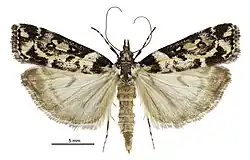 Wingspan for males and females is 23–26 mm. Head pale ochreous, face black. Palpi 2+1⁄4, black, mixed with white, basal joint white. Antennae black, beneath ochreous-whitish. Thorax white, anterior half, a square central spot, and posterior extremity suffused with black. Abdomen whitish-ochreous, slightly irrorated with grey, segmental margins more ochreous towards base. Legs white, thinly sprinkled with black, tibiae and tarsi banded with black. Forewings elongate, triangular, costa hardly arched, apex rounded, hindmargin sinuate, slightly oblique; white, irregularly irrorated with black scales which are ochreous at their base; a triangular blackish spot on costa at base, apex extended to form a smaller spot, but not quite reaching inner margin; inner margin beneath this whitish-ochreous; a broad cloudy white line near first line, more or less confluent with it above; first line broad, cloudy, white, oblique, hardly curved, rather irregular, posteriorly blackish-margined, forming a cloudy triangular blackish spot towards costa; a pale ochreous-yellowish streak along submedian fold from basal spot to anal blotch; orbicular roundish, whitish-ochreous, broadly back-margined, detached; claviform small, oblique, black, sometimes pale-centred, detached; reniform 8-shaped, whitish-ochreous, black-margined, connected with costa by a small blackish spot, between which and second line is a whitish suffusion; space between orbicular and reniform, and between reniform and second line, clothed with peculiarly appressed brassy prismatic scales, appearing as though transparent; second line broad, white, blackish-margined; terminal space wholly suffused with black; subterminal line broad, white, more or less pale ochreous-yellowish on veins, generally interrupted above middle, apex of lower portion touching second line; a hindmarginal row of white dots: cilia grey, with two darker lines, basal third slightly barred with whitish, tips whitish. Hindwings 1+1⁄2, whitish-ochreous, partially irrorated with grey; lunule, postmedian line, and a tolerably defined hindmarginal band rather dark grey; cilia ochreous-whitish, with two dark grey lines.