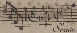 - Heinrich Ignaz Franz Biber's Rosary Sonatas for violin and continuo (c. 1674). Aside from the first ("Annunciation") and last works ("Passacaglia", for solo violin) of this collection, wherein the instrument is set to the common G-D-A-E tuning, the violin for each sonata is tuned to a different array of pitches. Sonata XI ("Resurrection") is a special case: in addition to a unique scordatura, the two inner strings of the violin are interchanged between the bridge and tailpiece of the instrument, thus creating a tuning (from top string to bottom string) of G-g-D-d. "Harmonia Artificiosa no. VII" in C minor is written in a form of scordatura on a nine line stave. See viola d'amore for more information.