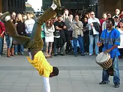 The capoeirista approaches the opponent and suddenly throws their body into a somersault, supporting themselves with their hands on the ground while kicking both feet towards the opponent's head.[2]
