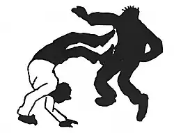 Scorpion kick is one of the distinct engolo kicks, first documented in drawings from 1950s.[8] It is not common among today's old practitioners, but some of them known how to execute it when asked.[9]