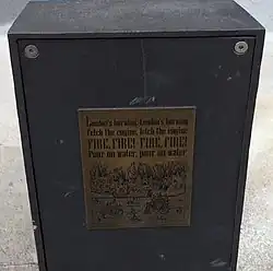 A drinking fountain next to the Monument to the Great Fire of London, showing the song's words