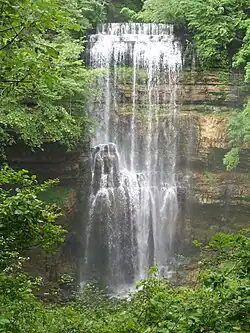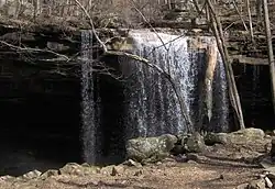 Virgin Falls, one of the area's most well-known and unique features, emerges from an underground stream on the south slope of Little Chestnut Mountain, drops 110 feet (34 m), and vanishes underground again. The source of the water for Virgin Falls is Virgin Falls Cave. The lower mouth to this cave is located approximately 150 feet upstream from the lip of the Falls. Virgin Falls Cave trends roughly southwest for 3,000 feet before ending in a massive ceiling collapse (breakdown). The cave stream easily flows through this breakdown, but no passage through the breakdown has been discovered. The cave itself is mainly one very large (30 feet wide and 40 feet high) stream passage. At the base of Virgin Falls, the water flows approximately 10 feet and falls into a large pit, the entrance to Virgin Falls Pit. At the bottom of this pit, the water follows cave passages and emerges as a spring at the base of the Cumberland Escarpment.[2]