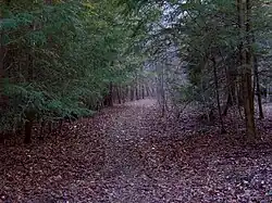 The Virgin Falls Trail heads west from Scott's Gulf Road toward Big Laurel Creek, passes Big Laurel Falls, and descends rapidly to the Caney Fork bottom-lands where it forks, with one branch heading east to the Caney Fork Trail and the other branch heading west up the slope of Little Chestnut Mountain to Virgin Falls.