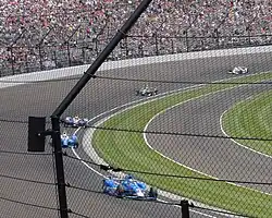 Dixon and CGR switched from CART to the IndyCar Series before the 2003 season, partly due to financial incentives and a desire to compete in the Indianapolis 500.[1] Although he was hesitant to participate in the all-oval track series because he was a road course specialist,[36] he quickly adapted to ovals.[37] Dixon won his debut race, the Toyota Indy 300 at Homestead–Miami Speedway, after leading the final 53 laps.[36] He sustained injuries in an accident with Tony Kanaan at Motegi two races later.[37] At his first Indianapolis 500, he qualified fourth; late in the race, he lost control of his car and spun through 180 degrees, finishing 17th.[38] Dixon took successive wins at Pikes Peak International Raceway and Richmond International Raceway and four second places in the next ten races.[28] He entered the season-ending Chevy 500 at Texas Motor Speedway as one of five title contenders and tied on points with Team Penske's Hélio Castroneves who required a victory to win the championship.[39] Dixon finished second, ahead of all other title contenders, to win the championship with 507 points.[40]