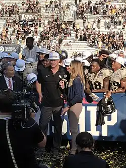 On December 1, 2015, Frost was hired as the head football coach at the University of Central Florida.[33] Frost replaced long time UCF head coach George O'Leary and interim head coach Danny Barrett, who took over the Knights when O'Leary resigned following an 0–8 start. The Knights went on to finish 0–12 that year. Frost immediately turned UCF around. He won six games in 2016, taking the Knights to the 2016 Cure Bowl, where they lost to Arkansas State.[34][35] In 2017, the Knights stormed through the regular season, finishing 11–0.[36] They won the AAC championship game 62–55 in double overtime at home against Memphis for their 12th consecutive win.[37] Frost led the Knights into the 2018 Peach Bowl, the school's second-ever appearance in a major bowl. In that game, they defeated 7th ranked Auburn, completing the first undefeated and untied season in school history.[38] Following the game, the school claimed a national championship which is recognized in the official NCAA record books.[B] He coached several NFL players, which include: Jordan Akins, Otis Anderson Jr., Nevelle Clarke, Gabe Davis, Kalia Davis, Jordan Franks, Richie Grant, Shaquill Griffin, Shaquem Griffin, Jacob Harris, Trysten Hill, Mike Hughes, D. J. Killings, Adrian Killins, Wyatt Miller, Jamiyus Pittman, Aaron Robinson, Cole Schneider, Tre'Quan Smith, Alex Ward, Marlon Williams, and Matthew Wright.