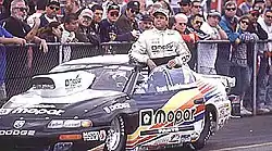 The two racers gave Mopar a hip, youthful image that complemented the company's performance marketing strategies. Geoffrion and Alderman could be seen at every national event talking to fans, signing autographs, and amplifying their "Butch and Sundance" personas with fan-friendly humor and gregarious attitudes. It was a high-water mark for Chrysler's modern day Pro Stock battle plan and Geoffrion was a perfect fit.[1]