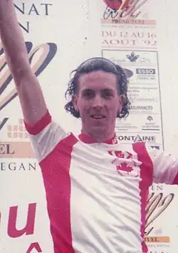 ![]() Scott Price wearing the Canadian road champion jersey after winning in 1992 Lac Megantic, Quebec | |