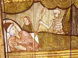 Walter Binning painted the new north gallery of Holyrood Palace in 1577.[13] Some of the Workman or Warkman family were settled at Burntisland in Fife the 1590s.[14][15] The Skelmorlie Aisle at Largs was signed by John Stalker, and initials "IM" painted at Delgatie Castle may be those of the painter John Mellin or Melville.[16] It appears that only the wealthiest of the merchant classes and aristocrats could afford this decoration, though the picture is unbalanced as more modest interiors do not survive.