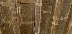 The largest group of these ceilings have patterns of fruit and flowers, and may perhaps have evoked tapestry borders and include religious iconography.[19][20] Some ceilings in galleries at the top of buildings incorporated vignettes with biblical or emblematic scenes. Others employ Renaissance grotesque ornament including symbolic emblems. A gallery in a demolished building on Edinburgh's Castlehill had scenes of the Apocalypse and Christ asleep in a storm, set in the Firth of Forth, with a backdrop of the Edinburgh Royal Mile skyline viewed from Fife.[21] Fragments survive in storage at the National Museums of Scotland.[22] Ceilings painted with rows of heraldic shields included; the gallery at Earlshall Castle and Collairnie Castle, Fife, a ceiling at Linlithgow High Street,[23] and Nunraw House, East Lothian. Some 17th-century schemes included the signs of the zodiac. The summer house or banqueting room at Gowrie House, known at the Monk's Tower was updated with symbols from the zodiac and the heraldry of George Hay, 1st Earl of Kinnoull.[24]