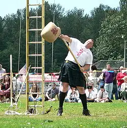 Highland games (Scottish Gaelic: geamannan Gàidhealach) is a competitive strength sport with events held in spring and summer in Scotland and several other countries with a large Scottish diaspora as a way of celebrating Scottish and Celtic culture, especially that of the Scottish Highlands. Certain aspects of the games are so well known as to have become emblematic of Scotland, such as the bagpipes, the kilt, and the heavy events, especially the stone put, Scottish hammer throw, weight throw, weight over bar, caber toss, keg toss and sheaf toss. While centred on competitions in piping and drumming, dancing, and Scottish heavy athletics, the games also include entertainment and exhibits related to other aspects of Scottish and Gaelic cultures.