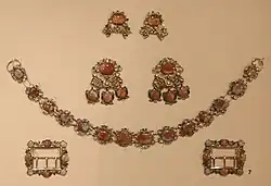 Pebble jewellery, featuring the stones agate or "Scotch Pebbles", Cairngorm, jasper, jaspagate, and sometimes bloodstone, freshwater pearls, gold, silver and granite, is a style of jewellery that has a long history associated with Scotland.[6] Queen Victoria helped make the style become fashionable and she collected cairngorm stones on her walks on Beinn a' Bhùird near Balmoral Castle.[7] Pebble jewellery refers to a style rather than a specific item, with many examples of pebble brooches and bracelets, though other items such as pendants have also been known to be decorated in this style.