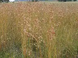 Natural temperate grassland is characterised by native perennial tussock grasses such as kangaroo grass (Themeda triandra syn. T. australis), snowgrass (Poa sieberiana) and river tussock grass (Poa labillardierei), together with speargrass species (Austrostipa sp.), wallaby grasses (Austrodanthonia sp.) and wild sorghum (Sorghum leiocladum).[15]
