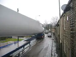 The detailed design for the project was completed during summer 2006 and construction began in January 2007.[26] The first task was to build a stable access road, but the moor was covered in a layer of peat with a low load-bearing capacity. The whole area had also been subjected to extensive coal mining during the 19th and early 20th centuries, so there was a potential for subsidence. To address these problems, the mining voids were grouted and a floating road was constructed, using a complex system of geotextiles and geogrids to prevent the road from sinking.[13] This was achieved by laying a crushed-gravel base, reinforced with polyester and polypropylene grids, to bridge any potential mine voids and ensure that the weak shear strength of the subsoil was exceeded by the base course material.[27] The wind turbines arrived at Scout Moor in parts, transported by large goods vehicles along the M66 motorway to Edenfield as part of a 76-day-long convoy of delivery.[28]