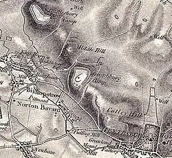 There are numerous other tumuli and long barrows in the area surrounding Scratchbury Camp, including some located on the adjacent and co-joined Cotley Hill to the southeast, and on Middle Hill to the west. On the crown of Cotley Hill is a further Bronze Age tumulus surrounded by an Iron Age enclosure.[1][3] Nearby to the northwest, on the side of Middle Hill, is the site of the deserted medieval village of Middleton, whose surviving earthworks consist of building platforms cut into lynchets and enclosed by a boundary bank and ditch, and a hollow-way.[25] There are also signs of strip lynchets immediately to the north of Scratchbury Camp on the side of the hill.[26] A Roman bronze spoon was found on or near Scratchbury Camp in 1804,[5] and a Roman urn was found in the surrounding area before 1856[27]