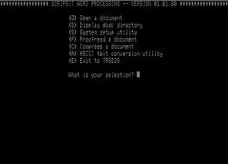 Scripsit (usually rendered in official marketing and support documents as SCRIPSIT) is a word processing application written for the Radio Shack TRS-80 line of computers. Versions were available for most if not all computers sold under the TRS-80 name, including the TRS-80 Color Computer and several pocket computer designs, as well as the Tandy version of the Xenix operating system. Tandy Corp. also produced a version running under MS-DOS for its line of PC compatible computers (Tandy 1000 and successors). Some of the 8-bit versions are tape-based and have no ability to read or write to disk.