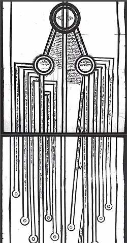 The scroll contains esoteric schematic diagrams of the cosmos. Well-springs (Classical Mandaic: ࡀࡉࡍࡀ, romanized: aina) are shown as small circles, mountains as triangles, and rivers (including the Tigris, Euphrates, and Karun) as long straight lines. Zamzam Well is also depicted.[3] Illustrations in the scroll depict Hibil Ziwa as the grand mediator and messenger of the Life.[4]: 70