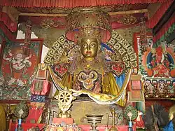 Reintroduction of Buddhism to Mongolia in the second half of the 16th century and its active penetration into all aspects of the Mongolian society directly influenced the further development and flourishing of sculpture and other arts in Mongolia.[1] Competing with Altan Khan of Tümed in religious and cultural endeavours, Abtai Sain Khan of Khalkha founded the Buddhist monastery Erdenezuu near the site of former Karakorum city in 1585.
