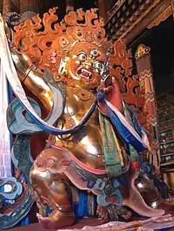 Mongolian Cham is of special interest because this type of sacred performance attained during its brief life span in Mongolia a level never equaled elsewhere. Although Tibetan and Mongolian manuals which detail the iconography and outline the choreography of the Tsam exist, eyewitness accounts of early Western travelers imply that the dances actually differed in many ways from the manuals.[16] Cham masks of Mongolian production, for example, have an artistic expressiveness only rarely matched in other countries.[16] Preparation of the masks for Cham was a complex and time consuming work. The shapes of the masks were first made of papier-mâché. At the end the masks were painted and gilded. The masks could be also finished with corals, pearls and jewels. The clothes were made of high quality silk and certain elements of the accessories or symbolic attributes were made of corals, pearls, jewels, tusks and camel bone. Every monastery had its distinguishing style of masks and decorations. Thus, the masks at monastery Zhanzhing-Choiren were of the size to fit the heads of the dancers who could see through glassed cuts of the eyes of the masks. The masks in the Urga style were exceptionally large, twice as big as a human head adding extra height to the dancer who could see through the mouth of the mask.[3] The mask of Dharmapala Zhamsran was made of papier-mâché; 6000 pieces of natural red coral of different sizes were inlaid along the oval face emphasizing the dynamics of the facial muscles. Dharmapalas or the Ten Khangal bodhisattvas were the main personages of Cham. Their wrathful images express the extent and depth of the efforts that are required in subduing the nisvanis—the vicious mind, the powerful inner enemy of each sentient being.