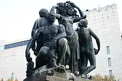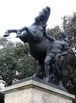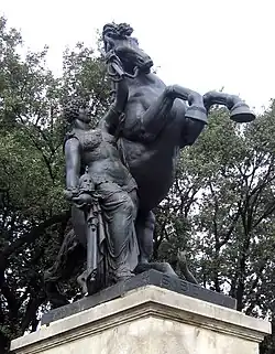 Plaça de Catalunya began to be urbanized in 1902, although the high point of the works took place in the 1920s, with a view to the celebration of the International Exposition. In 1927 a public competition was organized to decorate the square, in which it was decided to install 28 sculptures by artists such as Eusebi Arnau, Joan Borrell, Enric Casanovas, Josep Clarà, Josep Dunyach, Jaume Duran, Pablo Gargallo, Josep Llimona, Frederic Marès, Enric Monjo, Vicenç Navarro, Llucià Oslé, Miquel Oslé, Jaume Otero, Antonio Parera, Josep Tenas and Josep Viladomat.[2] This ensemble is one of the largest in Barcelona in terms of public art, and is an authentic open-air sculpture museum.