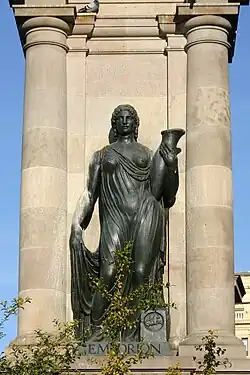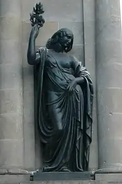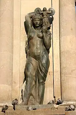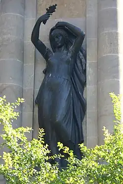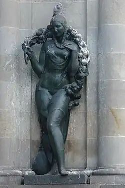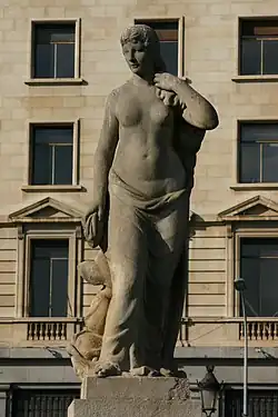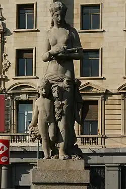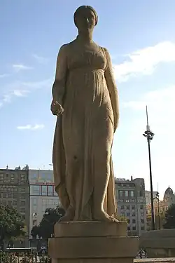 A public competition was organized in 1927 to decorate the square, with a jury made up of politicians and municipal technicians and a representation of the main artistic entities of the city.[8] Ninety projects were presented, of which the allegorical groups of Wisdom and Work by the Oslé brothers were chosen to appear in front of the Ramblas; three allegories of the Catalan provinces (Barcelona, by Marès; Gerona, by Parera; and Lérida, by Borrell) —the one of Tarragona was commissioned out of competition to Jaume Otero—; 16 stone statues for the colonnaded pavilion designed by Nebot, with works by Viladomat, Tarrach, Clarà, Llimona, Casanovas, Dunyach, Navarro, Arnau and Gargallo; and 12 statues and high reliefs for the niches in the square, by the artists Llimona, Navarro, Arnau, Tenas, Duran, Monjo, Gargallo, Alsina, Tarrach, Renart, Rebull and Soto. However, because of the "notorious difference in style with the rest of the square" the works of the last five were finally rejected in March 1928, and replaced by others by Monjo, Marès, Otero, Parera and Borrell. On the other hand, the derogation of the construction of the upper pavilion meant that in May 1929 eight of the sixteen sculptures planned for that space were finally not placed, while the rest were placed on a terrace that replaced the pavilion. Lastly, the placement of La Diosa by Clarà, a commission outside the competition, was approved.[9]