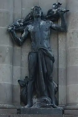 | Hercules | Antonio Parera | Bronze | 2,65 x 1,31 x 0,50 | It is located on the pilaster facing the sea, on the Besós side of the square. It represents the mythological hero Hercules, half-naked, with a cloak on his back, one of the folds of which covers his genitals. His arms are raised, holding a stone. The presence of this figure may allude to Jacinto Verdaguer's work La Atlántida, since according to the author, the demigod was the founder of Barcelona. In its lower part is the coat of arms of Gerona. It was cast by Gabriel Bechini (Barcelona).[30] | |