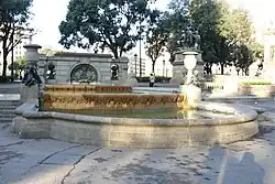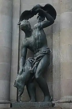 Finally, 28 works were installed: Maternity, by Vicenç Navarro; Young, by Josep Dunyach; The forger, by Josep Llimona; Woman with child and piccolo, by Josep Viladomat; Female Figure, by Enric Casanovas; Youth, by Josep Clarà; Flute Shepherd, by Pablo Gargallo; Navigation, by Eusebi Arnau; Barcelona, by Frederic Marès; Montserrat, by Eusebi Arnau; Female Figure, by Josep Llimona; Hercules, by Antonio Parera; Woman with Angel, by Vicenç Navarro; Tarragona, by Jaume Otero; Fuente de los seis putti, by Jaume Otero; Lérida, by Joan Borrell; Mujer con imagen de la Virgen, by Enric Monjo; El espíritu popular, by Jaume Otero; Pastor del águila, by Pablo Gargallo; Pomona, by Enric Monjo; Wisdom, by Miquel Oslé; The Goddess, by Josep Clarà; Work, by Llucià Oslé; Emporion, by Frederic Marès; Fisherman, by Josep Tenas; Woman, by Joan Borrell; Montseny, by Jaume Duran; and Gerona, by Antonio Parera.[10] Originally there was also in the square the group Niños cabalgando sobre peces (1928), by Frederic Marès, a fountain with water jets and four of the figures indicated in the title, which was moved in 1961 to the intersection of Gran Vía and Rambla de Cataluña.[11]