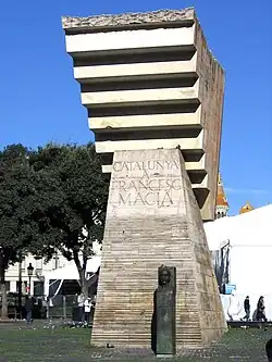 | Monument to Francesc Macià | Josep Maria Subirachs | Travertine, concrete, iron and bronze | 9,11 x 3,66 x 7,95 | Installed in 1991, this monument was the last sculpture placed in the square to date. It faces the Ramblas, next to Clarà's Goddess. In honor of the president of the Generalitat Francesc Macià, Subirachs conceived the work as an evocation of the various symbols of Catalan identity: the pedestal, made of travertine with a succession of blocks of stone in a break, represents the history of Catalonia; the upper part, made of concrete, is shaped like an inverted staircase, of which the first three steps, embedded in the pedestal, represent the three years of Macià's government at the head of the Generalitat, while the rest, ending abruptly and unfinished, symbolize the future of the country, which is being built day by day, step by step; Also, on the pedestal there are several inscriptions in the form of graffiti, with names, dates and places related to the Catalan politician, while at the top is in large letters the inscription Catalunya a Francesc Macià (Catalonia to Francesc Macià). On the back is the coat of arms of Catalonia, made of iron, and is engraved with a phrase of the president addressed to the Catalan deputies in 1932. In front of the body of the monument there is a separate monolith with the bust of President Macià, made in bronze, a replica of the portrait made by Josep Clarà in 1932. Subirachs wanted to give it a realistic air, which contrasts with the almost abstraction of the rest of the monument, to have a link with the noucentist style of the rest of the square. Foundry: Parellada (Lliçà d'Amunt).[47] |