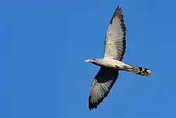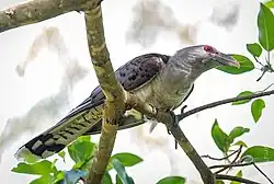 The world's largest cuckoo, the channel-billed cuckoo measures between 56–70 cm (22–28 in) long, with a 88–107 cm (35–42 in) wingspan, and weighing between 560–935 g (1.235–2.061 lb).[13] 24 adults were found to have averaged 684 g (1.508 lb) in body mass.[14] According to a manual on avian body masses, another species of cuckoo, the buff-headed coucal, may have a mean body mass some 11% higher than the channel-billed cuckoo.[14] The bill is bi-coloured, with a grey base becoming straw-coloured at the tip. The bill is large slightly curved and reminiscent of the bills of hornbills; in fact, the bird is sometimes erroneously referred to as a hornbill.[15] The plumage of the adult is pale grey on the head, chest, belly and back, becoming paler and barred lower down on the belly. The wings are darker grey with dark tips on the feathers. The tail is dark grey on top and barred underneath with a black band and white tip at the end. The feet and legs are black, and the eye is surrounded by prominent red skin. While most other very large cuckoos are rather terrestrial (i.e. roadrunners or the genus Neomorphus), the channel-billed cuckoo is fairly arboreal and is capable both in trees and on the ground.[16] The channel-billed cuckoo is a strong flier, with a distinctive, almost hawk-like cross-shaped (cruciform) flight silhouette.[13] There is some sexual dimorphism in both plumage and dimensions, the female having a smaller bill and paler, more barred undersides.