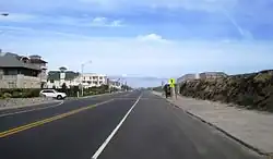 The Sea Bright communities of Navesink Beach, Normandie, Downtown, and Low Moor and the northern portion of Monmouth Beach, known as Galilee, are located on the barrier spit of land south of the Sandy Hook peninsula (part of the Gateway National Recreation Area) between the Atlantic Ocean and the Shrewsbury River estuary. The peninsula is generally 1,000 ft (300 m) wide with an elevation of between 5 ft (1.5 m) and 10 ft (3.0 m)[5] and forms western approach to the Port of New York and New Jersey. The seawall begins south of the Highlands – Sea Bright Bridge and lies between the beach and Route 36, locally known as Ocean Avenue, which is part of the New Jersey Coastal Heritage Trail Route.