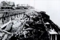 New Jersey Southern Railroad built a 2,000-foot trestle and a seawall on the ocean side of the narrow peninsula in the 1870s, and rebuilt it again in 1881.[15] To protect Fort Hancock the U.S. Army constructed a seawall between Sandy Hook and Sea Bright in 1898. At times there was not beachfront between Sandy Hook and Long Branch.[16] The seawall was built in phases between 1914 and 1962.[17][18] The parent of NJS, the Central Railroad of New Jersey abandoned the property in 1950. The state did not opt to buy the 3.5 miles (5.6 km) strip of land that had been the railroad's right of way.[19] The state built a new seawall starting in 1946 into the 1950s.[20] By the late 1980s, the seawall had seriously deteriorated and repairs were undertaken in 1990.[21]