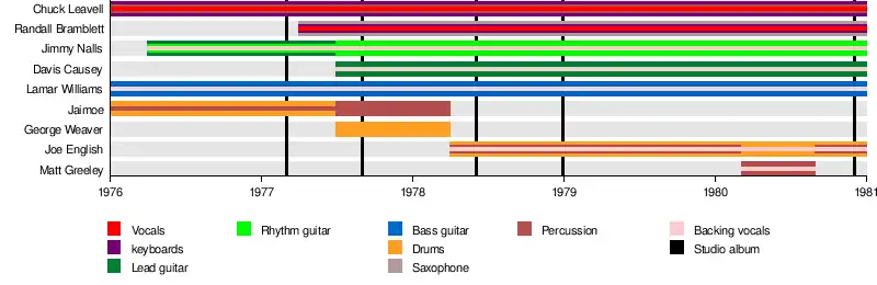 After the release of their first album, the group expanded to a septet with the additions of Davis Causey (guitar), George Weaver (drums, percussion) and Randall Bramblett (saxophones, keyboards and vocals). That configuration recorded the group's second album, Cats on the Coast, in 1978 (with the leadoff track, "That's Your Secret",[7] reaching #50 on the Billboard Hot 100 and #45 in Canada.[8]) By the time of the third album, On the Edge, Jaimoe and Weaver had both left, replaced by Joe English. The sextet of Bramblett, Causey, English, Leavell, Nalls and Williams recorded the fourth album, Long Walk on a Short Pier (1979), unreleased in the United States for nearly twenty years, adding percussionist Matt Greeley for their fifth and final album, Ball Room, issued on Arista in 1980. Their greatest hits album (CD) wrapped up their body of work, minus a handful of appearances on various compilation albums (mostly Southern Rock). They were also featured on a 1978 live Southern Rock album which included a live version of "Grand Larceny."