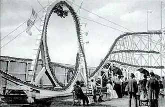 The park also included the infamous Flip Flap Railway, which was a roller coaster ride, designed by Lina Beecher, that inverted the riders in a loop after fall from a height of 20m.[4] The ride was too dangerous and was closed. Boyton also added an old mill style ride called Cages of Wild Wolves, and a ballroom (1899).[1]