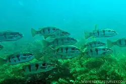 The sea trumpeter has a moderately deep, long body which is compressed. It has a relatively small, oblique mouth with the upper jaw just reaching, or falling short of, the front of the eye. It has very small, conical teeth arranged in a single band on each jaw, with the outer teeth larger than the inner teeth. The dorsal fin contains 12-13 spines 11 soft rays with a notch two thirds of the way along it and the soft rayed part is rounded. The anal fin is similar in size and shape to the soft part of the dorsal fin and contains 3 spines and 10 soft rays. The caudal fin is slightly notched. There are 80-90 scales in the lateral line. The colour pattern is light greyish to brown dorsally, silvery to white ventrally with 4–5 broad dark vertical bands on the flanks which are more obvious immediately above the centre of the flanks. There are dark stripes on the head which run through and below the eyes. There are small darks spots on the soft part of the dorsal fin, the anal fin and the caudal fin. The juveniles also have 3 horizontal lines of dark spots on their back.[2] They can attain a maximum total length of 38 centimetres (15 in).[1]