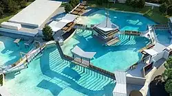 The Seals at Play exhibit was located in the centre of the park near the Carousel. The exhibit featured two separate enclosures under a circular shade. In 2005, a seal exhibit named Seal Rocks was proposed for the area where Ray Reef now stands.[3] It was intended to replace the Seals at Play exhibit; however, the proposal never progressed and the exhibit was cancelled.[3] On 9 July 2007, the Seals at Play exhibit was closed to make way for an expansion of Sesame Street Beach.[4][5] The seal population formerly on display in the exhibit was relocated to areas in the park's back of house.
