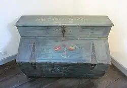 Seaman's chests were stored in the crew's quarters and were used as seats as well as containers for sailors' personal effects. Items that were stored in these chests include clothing, tools, keepsakes, and things for entertainment, such as books or cards.[1] Most seaman's chests were decorated only with a coat of paint and the owner's name, although some had intricate paintings or carvings.[2] Chests are mounted on two parallel wooden beams, similar to runners, which helps to prevent damage from sliding as well as insulating them from moisture on the floor of the ship. The sides of the chests are not vertical, but rather slant inwards slightly. This lowers the center of gravity, making the chests less likely to tip over. The lid of a seaman's chest extends over the sides and is intended to be used as a seat. Seaman's chests are always equipped with a lock as well as handles on either side, known as beckets. These handles were made of cordage and were often woven into decorative patterns by sailors. Almost all chests contained at least one small compartment attached to the right-hand side, though some had compartments extending across the entire length of the interior.