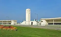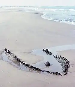 In southern Seaton Carew is the bus station, with a renovated, Grade II listed Art Deco clock tower and shelters.[51] South of this is a beachside car park overlooking Seaton Carew Wreck, the protected remains of a wooden collier vessel on the beach below the tide line.[52] There are numerous other wrecks both in the beach and just off shore. Further south east beyond the village is Seaton Carew Golf Course. The course is sandwiched between the coastal sand dunes and Seaton Common marsh, all known collectively as Seaton Dunes and Common an SSSI. The coastal dunes lead south-east to North Gare breakwater, a concrete pier built between 1882 and 1892[53] protecting the northern side of the mouth of the Tees. Second World War anti-tank blocks still remain on the beach on the seaward side of the breakwater, and the breakwater itself is fenced off as part of its concrete surface is in a dangerous condition after a partial collapse. Due south of the breakwater is Seaton Snook a promontory into the mouth of the Tees that has lent its name to other areas of land close by. To the west of Seaton Carew is the Durham Coast Railway Line and the Seaton Carew railway station.