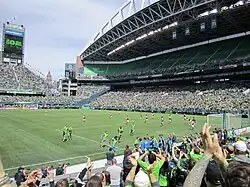 The Sounders hosted its three group stage matches during the 2025 FIFA Club World Cup at Lumen Field, where a temporary grass surface was installed over the turf for the tournament.[190] The team opened the tournament against Botafogo, the reigning Copa Libertadores champion from Brazil, and lost 2–1 after they had attempted a late comeback. Cristian Roldan scored the first goal by an American team in the tournament's history.[191] Spanish side Atlético Madrid then defeated the Sounders 2–1 in front of 51,636 spectators at Lumen Field, with the lone goal from the home team scored by Albert Rusnák.[192] The team were eliminated from the competition in a 0–2 loss to Paris Saint-Germain, the reigning UEFA Champions League winner, and finished at the bottom of their group.[193] The Sounders received praise from their opponents for their performance in the Club World Cup, but were unable to capitalize on scoring chances during the three matches.[194][195]
