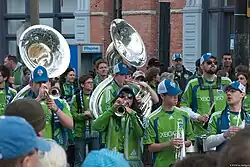 Drew Carey also requested that Sounders FC have their own marching band. They are the first club in MLS to have one.[16] This led to the creation of the Sound Wave, a 53-member marching band consisting of brass and marching percussion.[17] The band plays music from multiple genres such as Latin, rock and pop,[17] and sits with the supporters in the north end of CenturyLink Field.[18] The March to the Match, in which fans march from Occidental Park to CenturyLink before each home game, is led by the Sound Wave.[19]