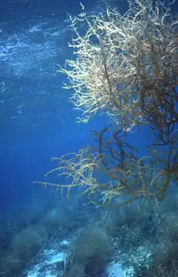 Similarly, seaweed farms may offer habitat that enhances biodiversity.[22][23] Seaweed farms have been proposed to protect coral reefs[29] by increasing diversity, providing habitat for local marine species. Farming may increase the production of herbivorous fish and shellfish.[5] Pollinac reported an increase in Siginid population after the start of farming of Eucheuma seaweed in villages in North Sulawesi.[13][19][22][23]