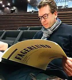 The Clarinet Concerto (2006) marked a turning point in Fagerlund’s career as a composer, and was followed by the tone poem Isola (Island, 2007), another major orchestral work. Both works were premiered at the Korsholm Music Festival. His surrealistic chamber opera Döbeln (2009), constructed around hallucinations, won the Record of the Year Award of the Finnish Broadcasting Company (Yle) and was a commission from the West Coast Opera Kokkola. Further works include Ignite (2010) and the violin concerto Darkness in Light, written for Pekka Kuusisto and immensely successful when premiered in Tampere in September 2012. The concerto was partly inspired by the literature of Haruki Murakami. The guitar concerto, Transit (2013),[7] commissioned by Yle and premiered by Ismo Eskelinen has continued Fagerlund’s series of concertos.